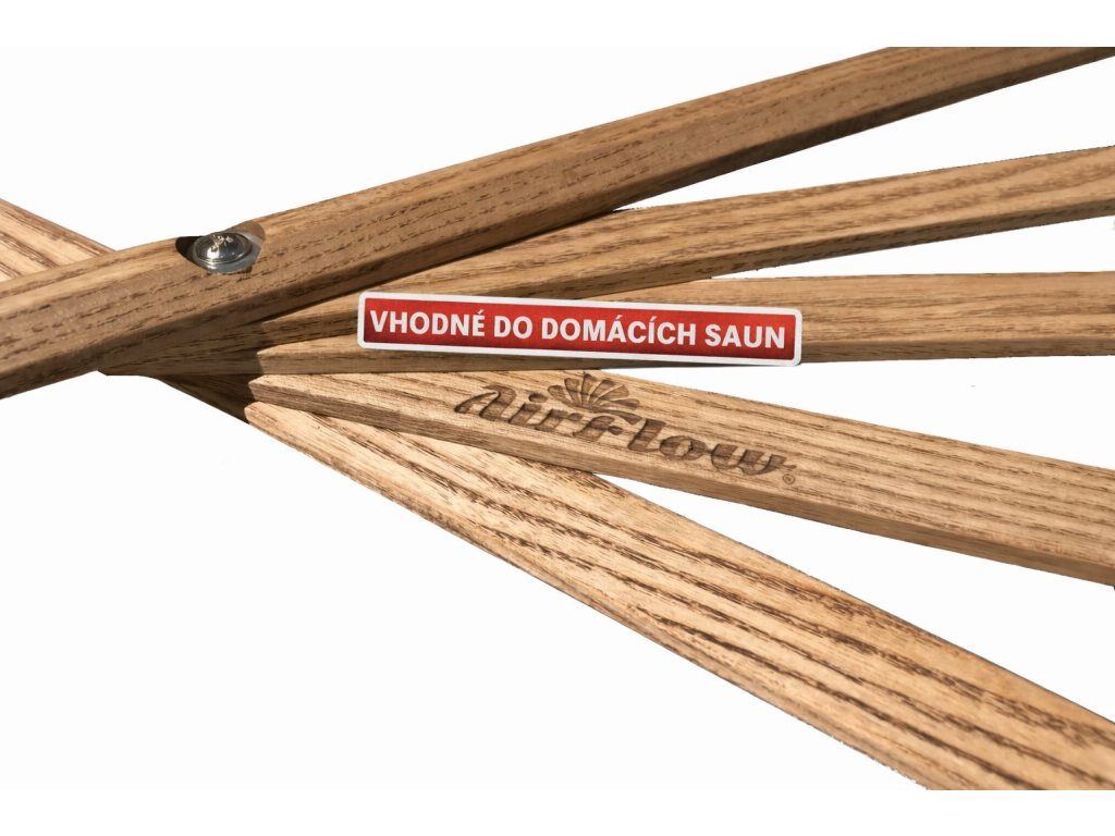 Nejmenší AirFlow vějíř – ideální i do domácích saun.o průměru 66 cm , konstrukce vějíře jasan (tmavý olej), látka kepr