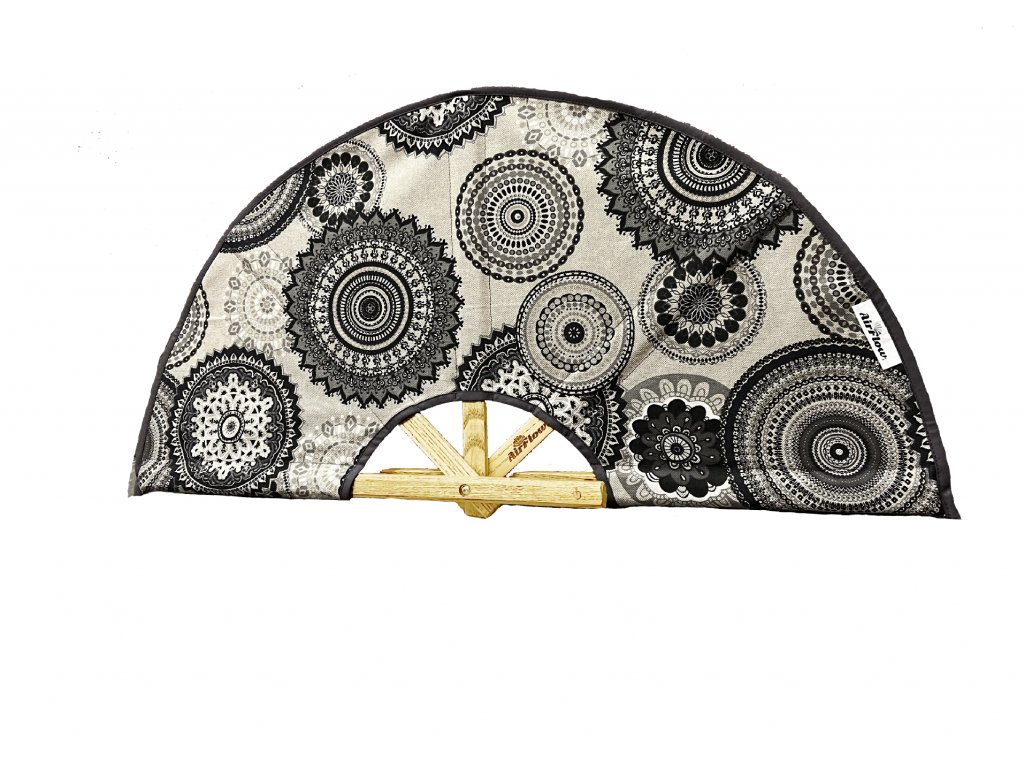 Spezielle, leichte Saunafächerkonstruktion aus Teakholz mit einer Spannweite von 66, 100 oder 130 cm. Wie auch die Eschenkonstruktion verfügt sie über einen arretierbaren Griff. Der Bezug ist in den Farben Weiß, Orange, Gelbgrün, Braungrün, Schwarz sowie als Spezialedition mit Mandalas erhältlich. Er ist handgenäht aus Köperstoff, einem strapazierfähigen, waschbaren Material, das feuchtigkeits- und hitzebeständig ist. Die Fläche des Fächers beträgt je nach gewählter Größe ca. 0,21, 0,36 oder 0,6 m². Das Gewicht der reinen Konstruktion liegt bei 195 g, 280 g bzw. 485 g.
