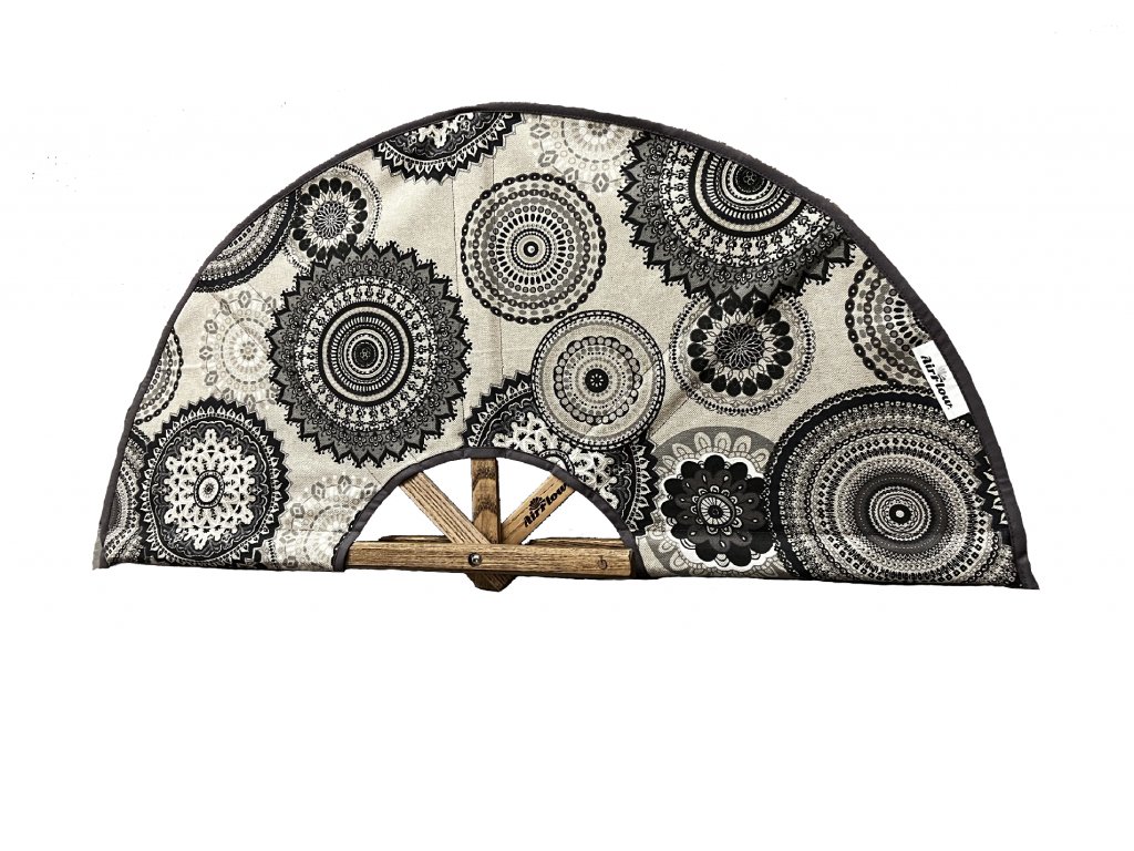 Saunafächer mit einem Durchmesser von 66 cm, Gestell aus Eschenholz (dunkles Öl), Köperstoff.